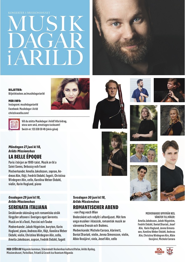 Vi gläds åt att återigen kunna bjuda in er till Musikdagarna som kommer att starta redan efter midsommarhelgen! Vi bjuder på 3 olika program med oilka klassiska teman som alla kommer äga rum i Arilds Missionshus den 27, 29 & 30 JUNI. Det är underbart att musiklivet flödar igen och att vi kan njuta musik tilsammans på ett ännu mer avslappnat i år. Vi kommer även i år erbjuda lyssnarplatser utomhus för den som önskar det.